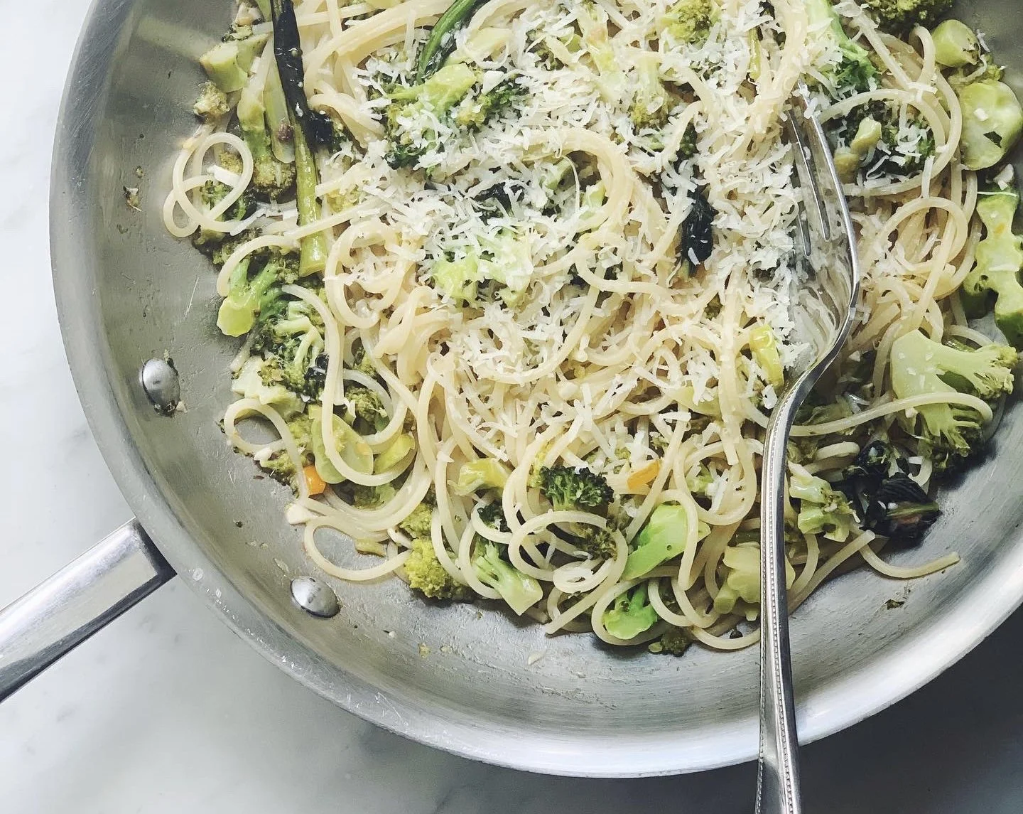 3. While the broccoli is cooking, bring a pot half filled with water to a rolling boil and salt it generously. Drop in the pasta and cook until slightly underdone—very al dente. Transfer the pasta to the skillet and add a ladle of the cooking water. Raise the heat under the skillet to medium and cook until the water is absorbed, and the pasta is al dente, just a couple of minutes. Add a handful of Pecorino cheese and stir to incorporate it.